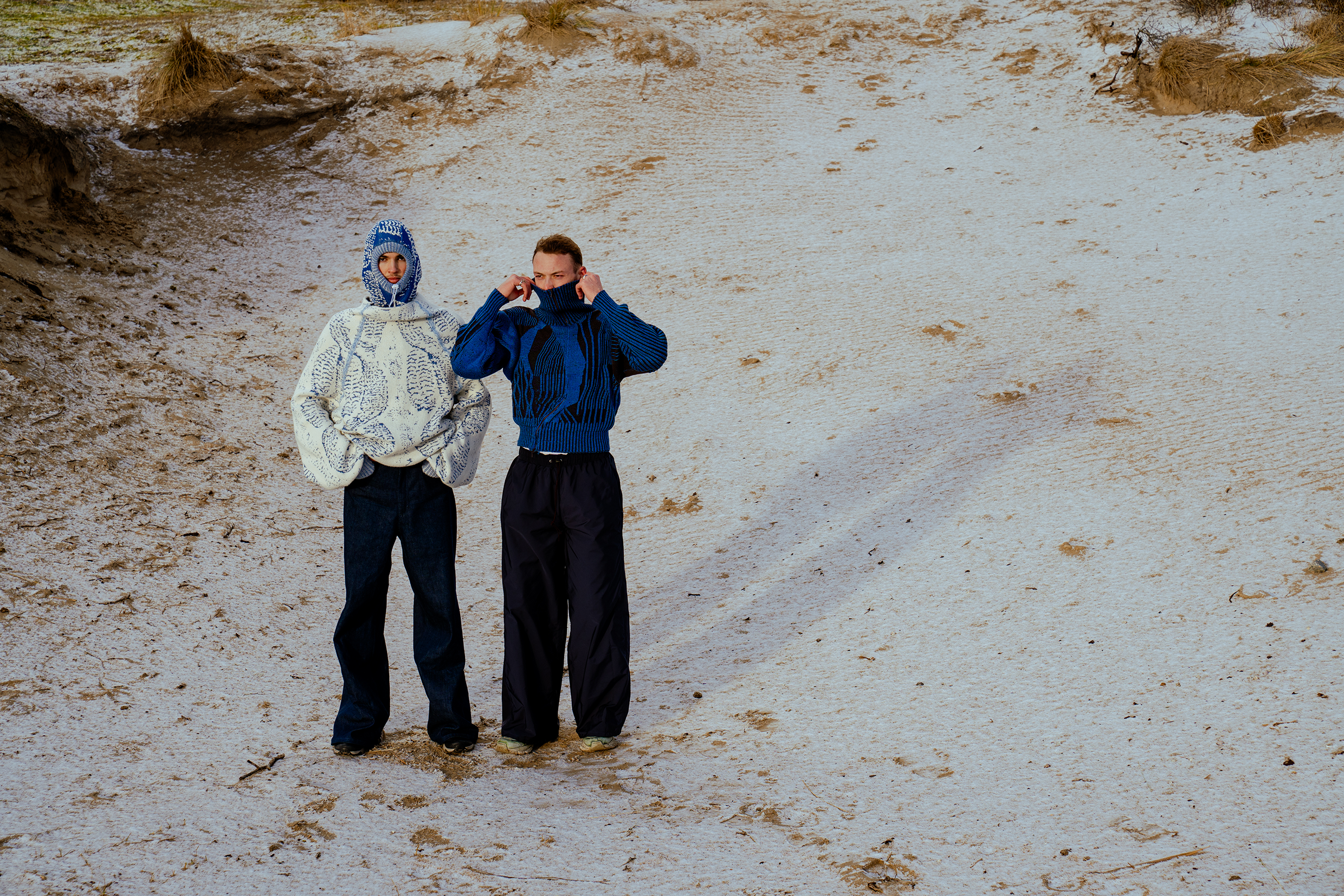 This collection is comforting by approaching the known, traditional, and timeless artistry of cable knits into a playful and contemporary sense. Drawing inspiration from the deep-rooted Irish heritage and traditions associated with cable knits, I aim to blend modern sensibilities with their rich history. The beauty and versatility of these patterns are showcased through influences from Irish nature, translated into earthy tones such as deep blues and rich browns. The essence of the cable knit is highlighted by exploring it through innovative techniques, with a focus on illusion and structure. This is expressed in sturdy yet soft knits that feel like a solid fog—familiar to the wearer, yet evocative of mystery. Designed to provide comfort and warmth for outdoor activities, the knitwear communicates profound tradition in a contemporary and playful manner. This approach not only ensures functionality but also stimulates a sense of community among the wearers, encouraging them to be an integral part of this unique and tradition-infused knitwear community. The project is made to last, using strong, durable yarns derived from natural materials, with the intention of being passed down to future generations. Produced on an industrial machine, they strike a balance between using luxurious yarn while remaining affordable for young people. These pieces are knitted to create lasting memories in outdoor settings.